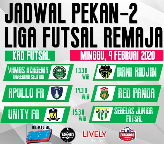 Liga Futsal Remaja 2020 akan menggelar pekan kedua pada 9 Februari 2020 di lapangan KAO Futsal Cipondoh Tangerang Homebase dari Sebelas Junior Futsal. Pada Klasmen terkahir Apollo FA untuk sementara memimpin klasmen dengan perolehan point 3 serta plus lima gol lebih banyak.